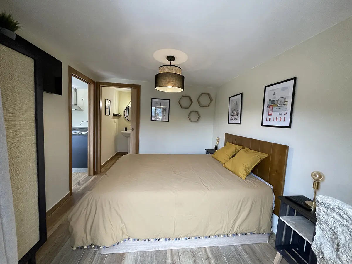 Siendo esta la casa más pequeña dentro del Ecolagar, se caracteriza por ser de una sola planta y con una habitación doble con baño propio haciéndola ideal para parejas y familias.